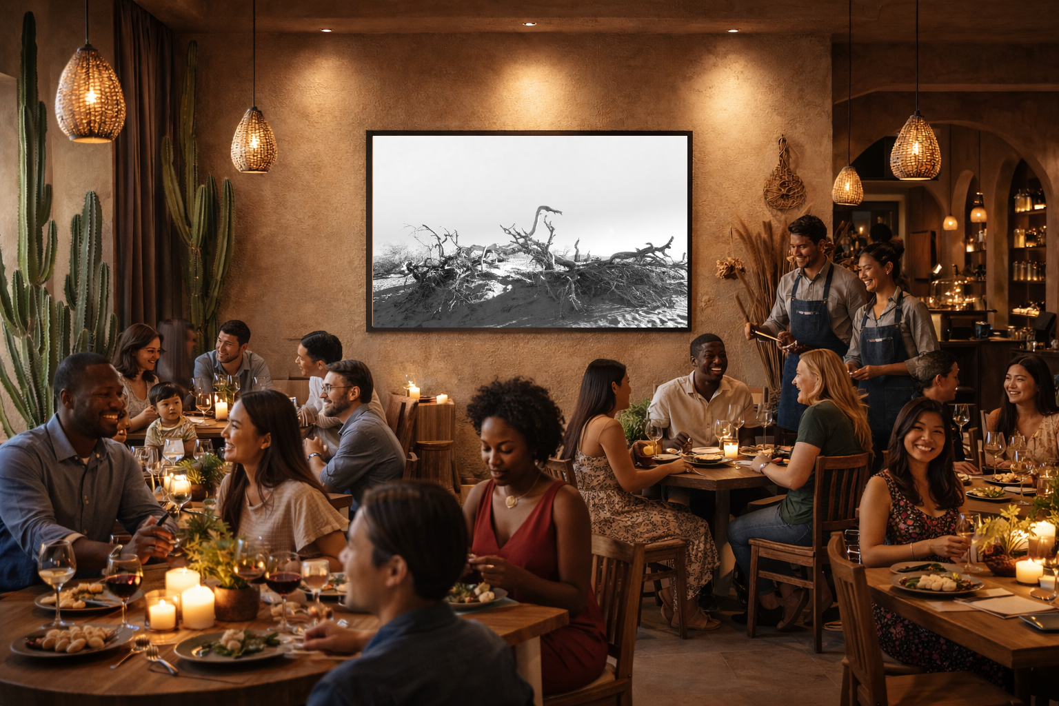 Restaurants are immersive environments where lighting, texture, sound, and visual elements all shape the experience. Artwork should support the concept of the space, reinforcing its mood and identity while giving guests something to discover and return to.